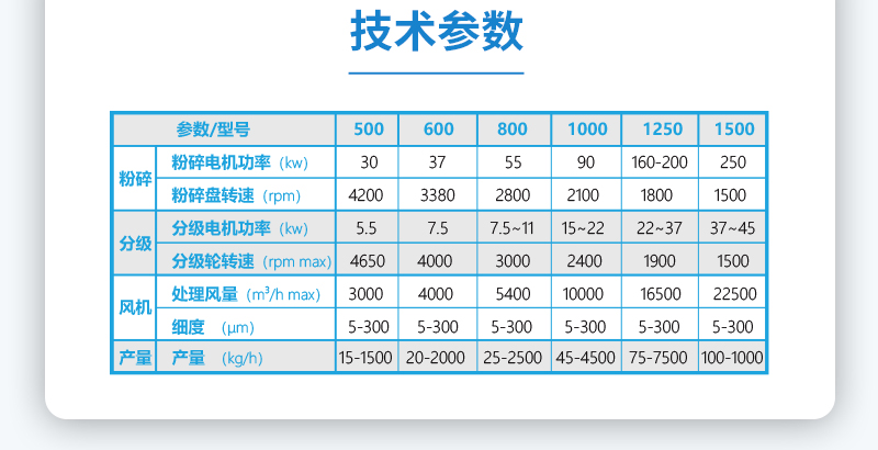 內含分級裝置,產品粒度D90:10-45微米之間可調,粒形好,粒度分布窄。