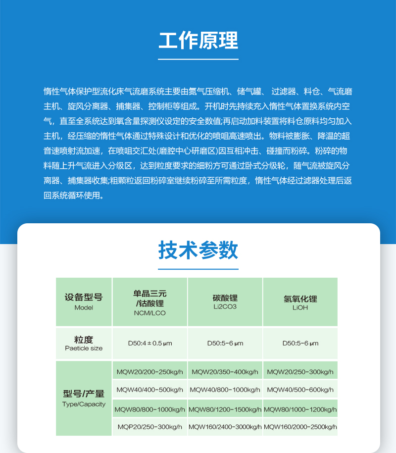 碳酸鋰氣流粉碎機是一款具有多項優勢的機械設備,其中包括無污染粉碎產品、細度可調、粒度分布集中、顆粒形貌規則、處理能力大、自動化高等。碳酸鋰氣流粉碎機采用獨特的陶瓷內襯,保證了產品安全無污染,對粉碎物料的細度有很好的控制,可根據客戶需求調整粉碎細度;粒度分布集中,顆粒形貌規則,粉碎質量高;處理能力大,效率高;操作簡單,自動化程度高;運行穩定,噪音低,適用于醫藥級碳酸鋰和電池級碳酸鋰的生產,是您理想的碳酸鋰氣流粉碎機選擇。